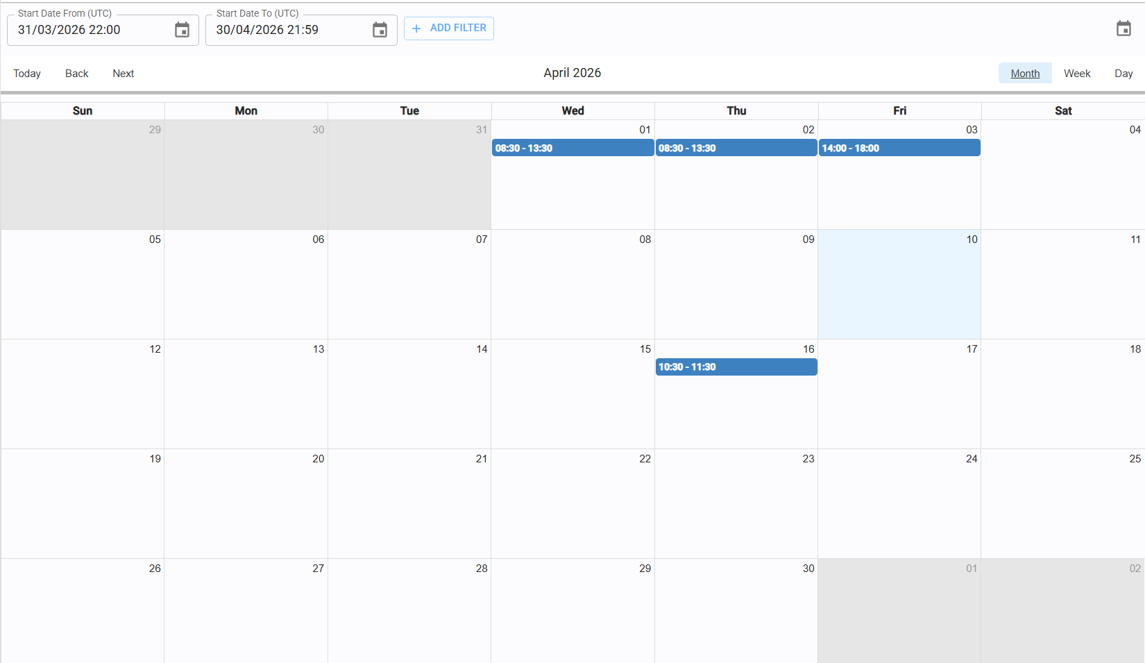 The calendar supports three views for better scheduling precision: Month, Week, Day.
