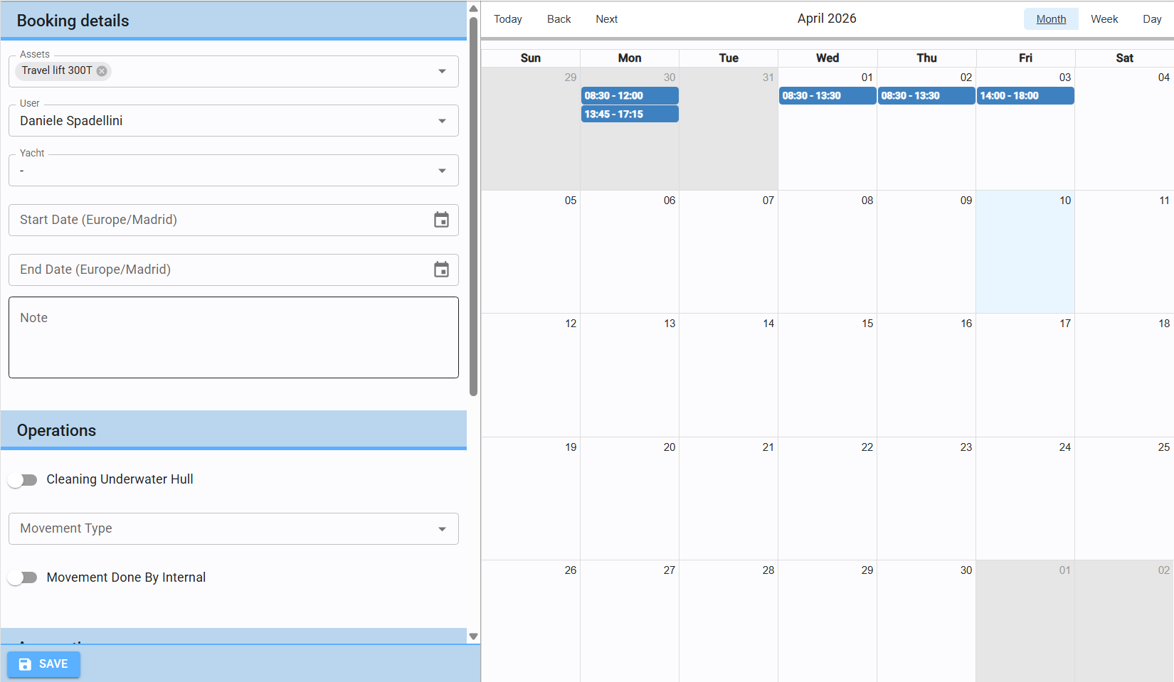 Yacht, Notes, and fields related to Operations and Accounting are not required to save the booking.