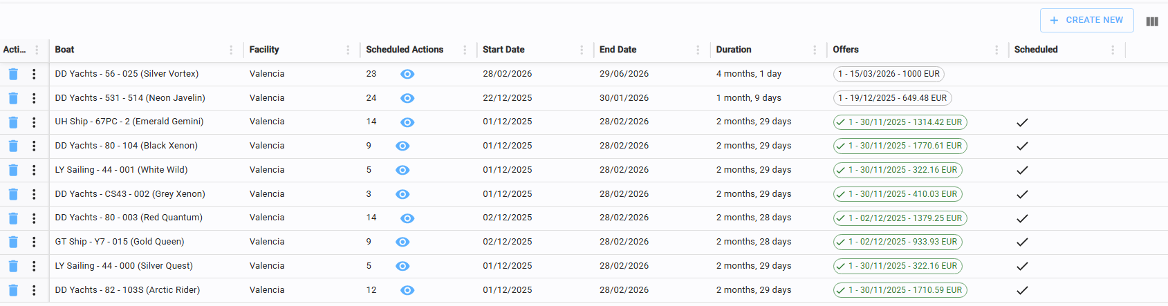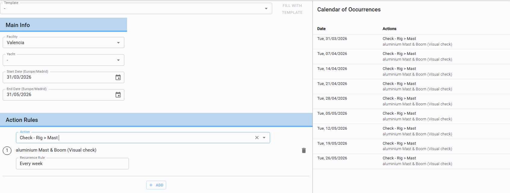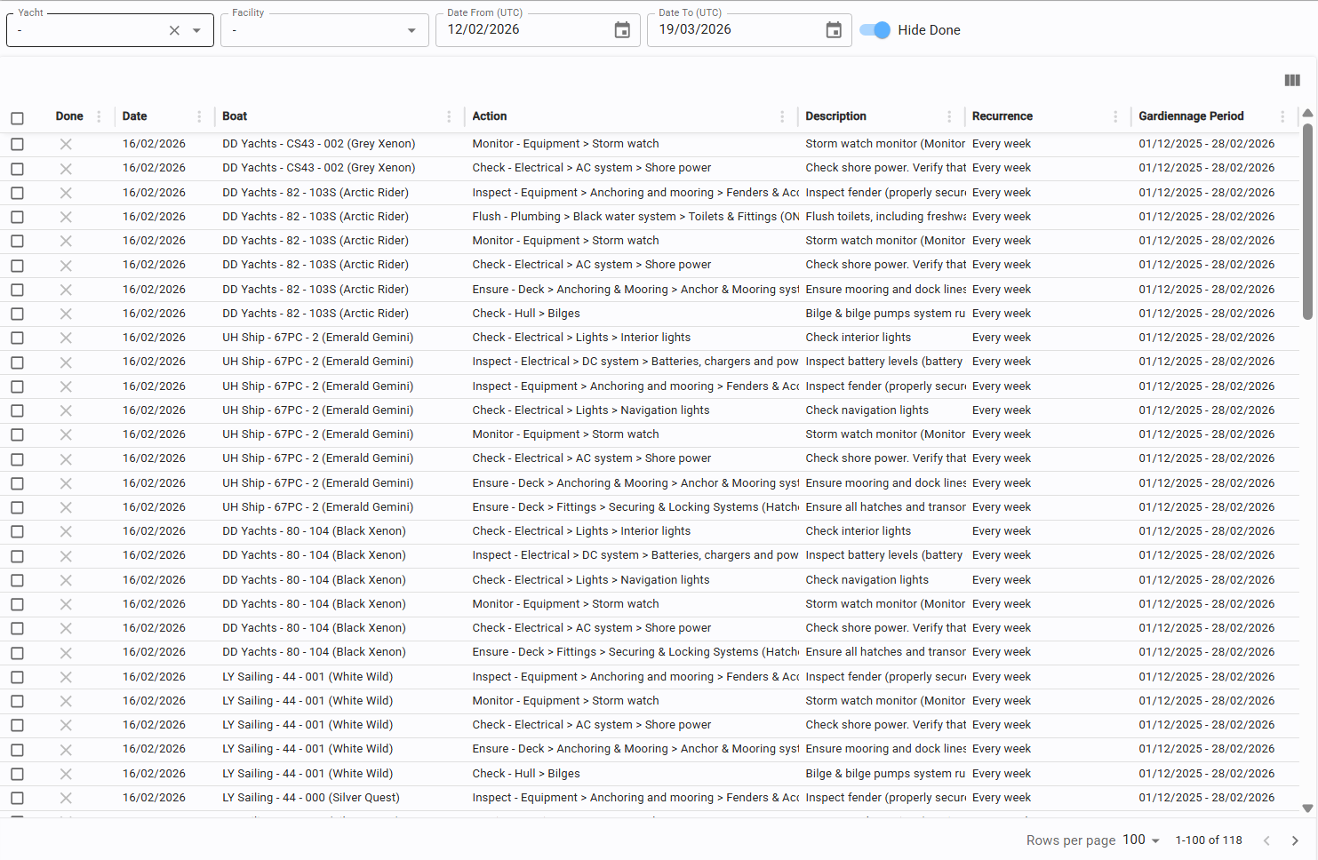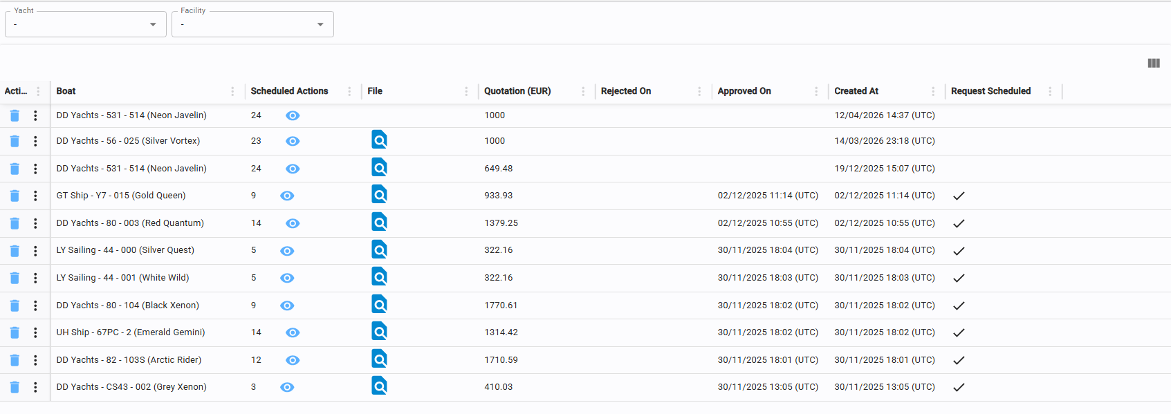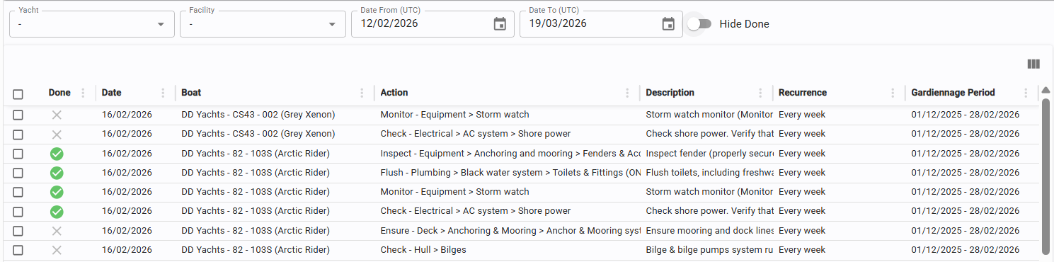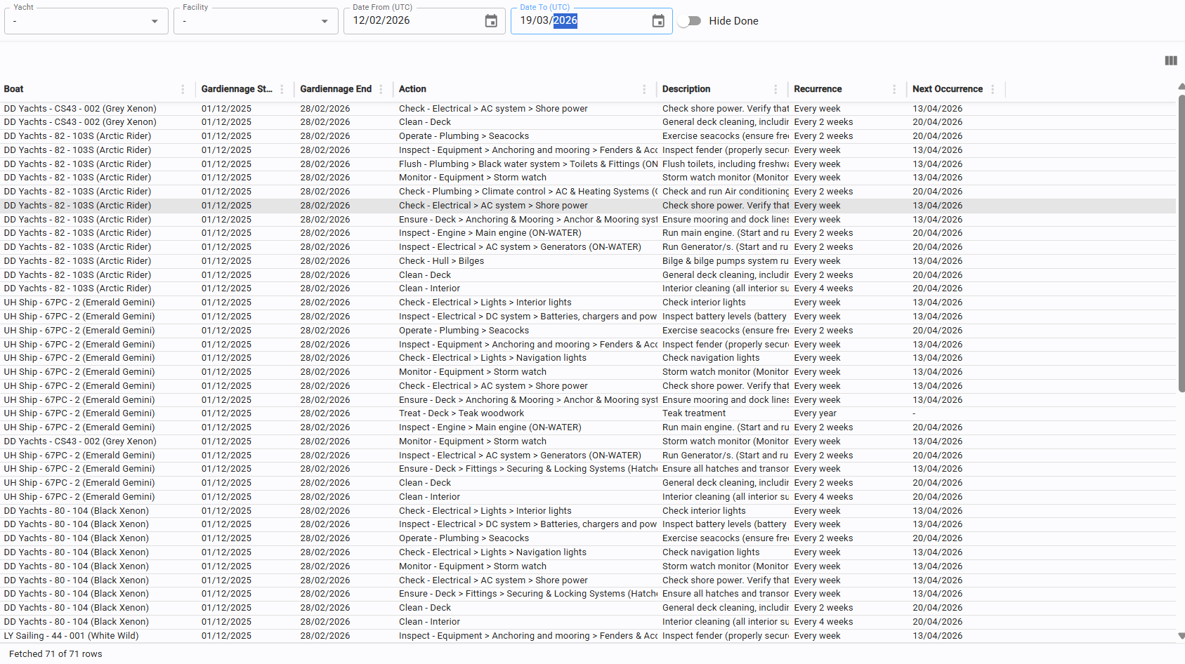 For each yacht, it shows the requested actions, their frequency, the overall period, and the date of the next scheduled occurrence.