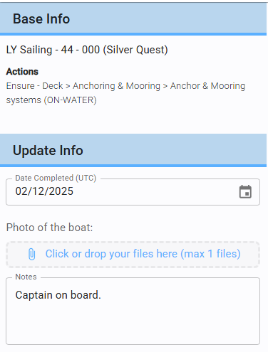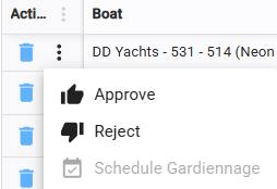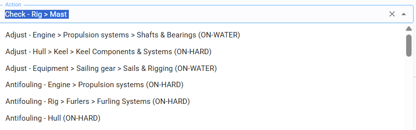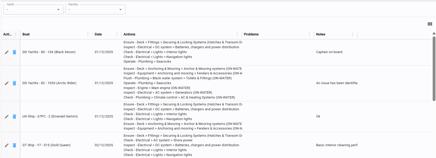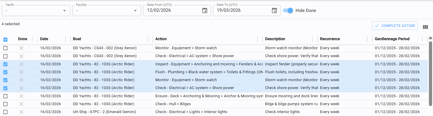 To execute actions, the user selects one or more items from the Occurrences list using the checkbox in the first column (Note: Select actions for one yacht at a time).