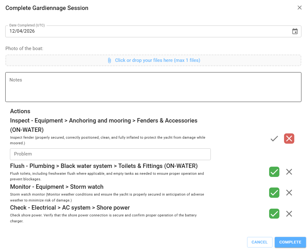 This is the page where actions are marked as completed by creating a Gardiennage Event (see Create new gardiennage event).