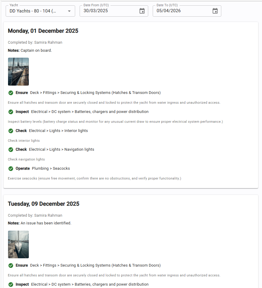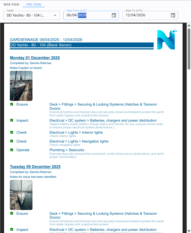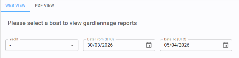 Gardiennage reports can be generated at any time. Select the Yacht and the desired Time Period to compile the data