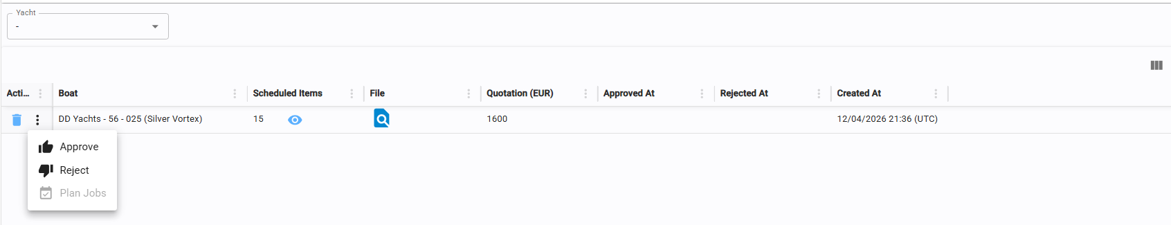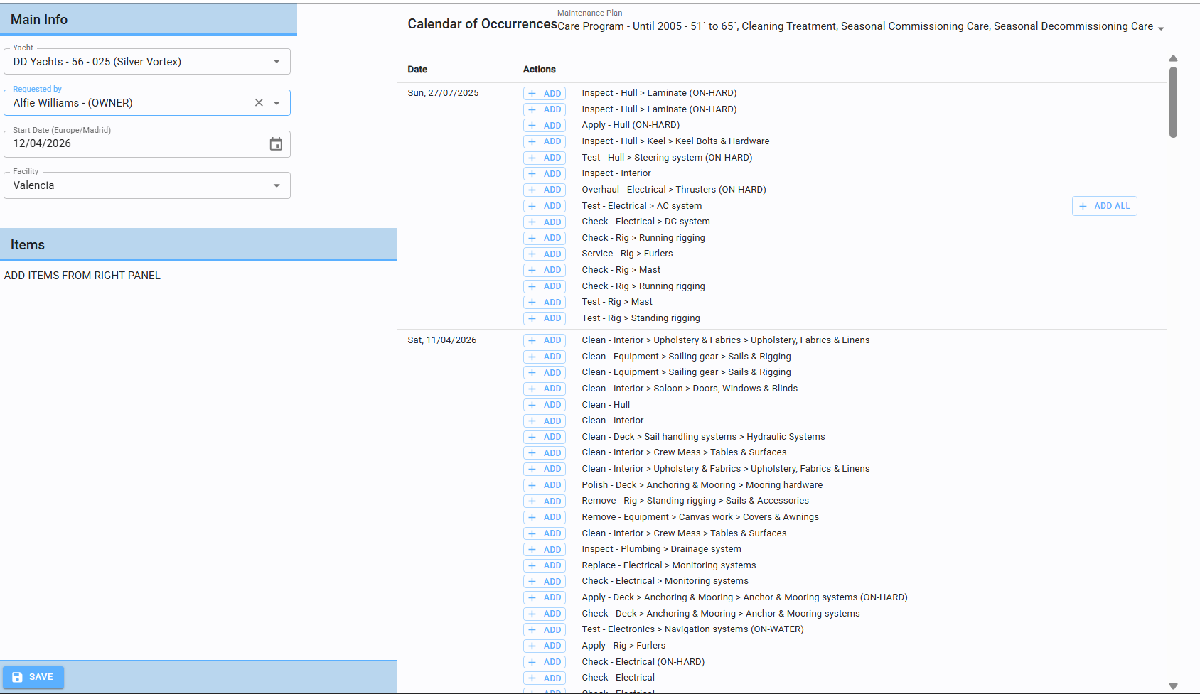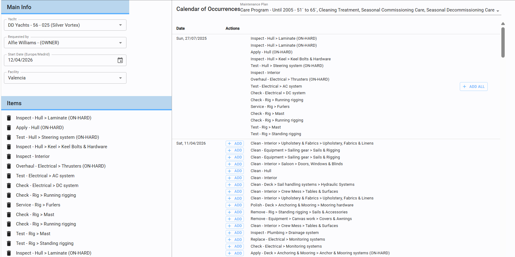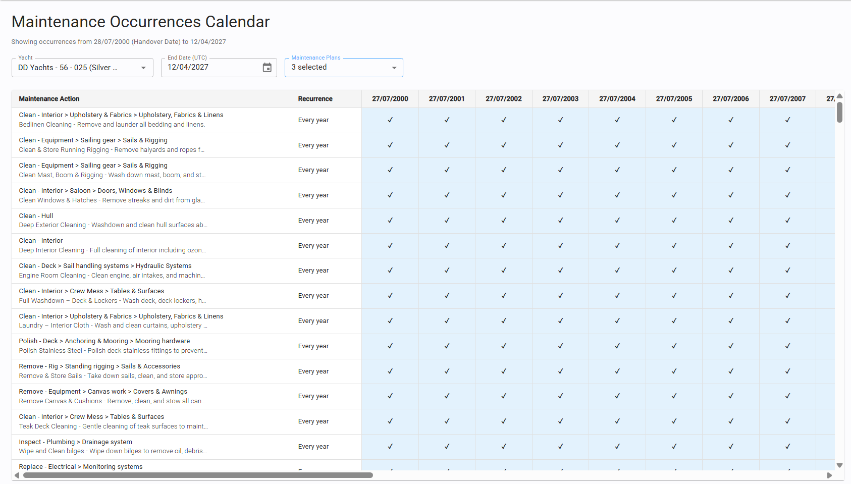 Right Section: Once the yacht and date are selected, the system automatically displays all recommended maintenance tasks based on the deadlines defined in the Plans.