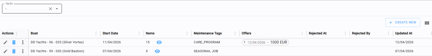 Beyond the standard Delete and Create New functions, additional actions are accessible via the three vertical dots in the Action column, including Make Offer (see Create offer) and Reject.