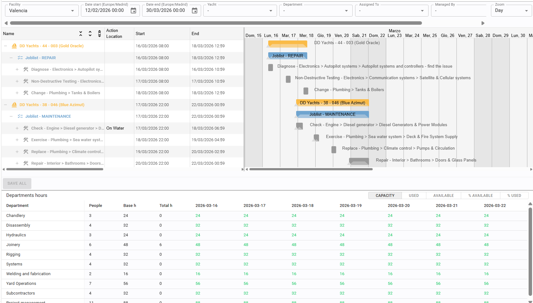 This page contains the scheduling for all approved work within the facility. It is designed for resource allocation and management, monitoring job progress, timelines, and departmental man-hours.