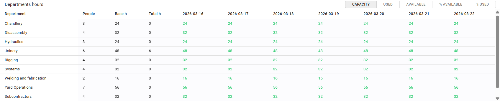 This section displays the capacity and total man-hours of each department on a day-by-day basis.