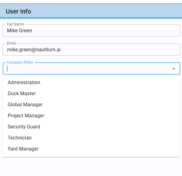 Within the creation/editing form, you can assign one or more Company Roles to a user.