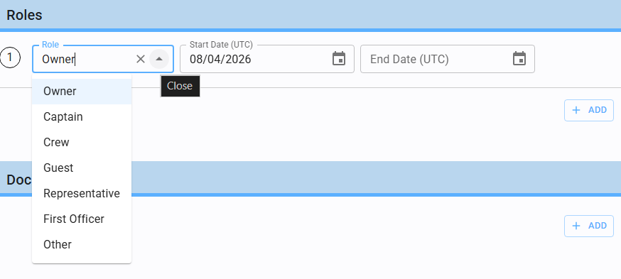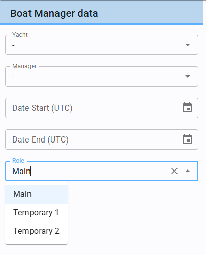 Mandatory Fields: You must specify the Yacht, Manager, Start Date (indicating when the responsibility begins), and the Role.