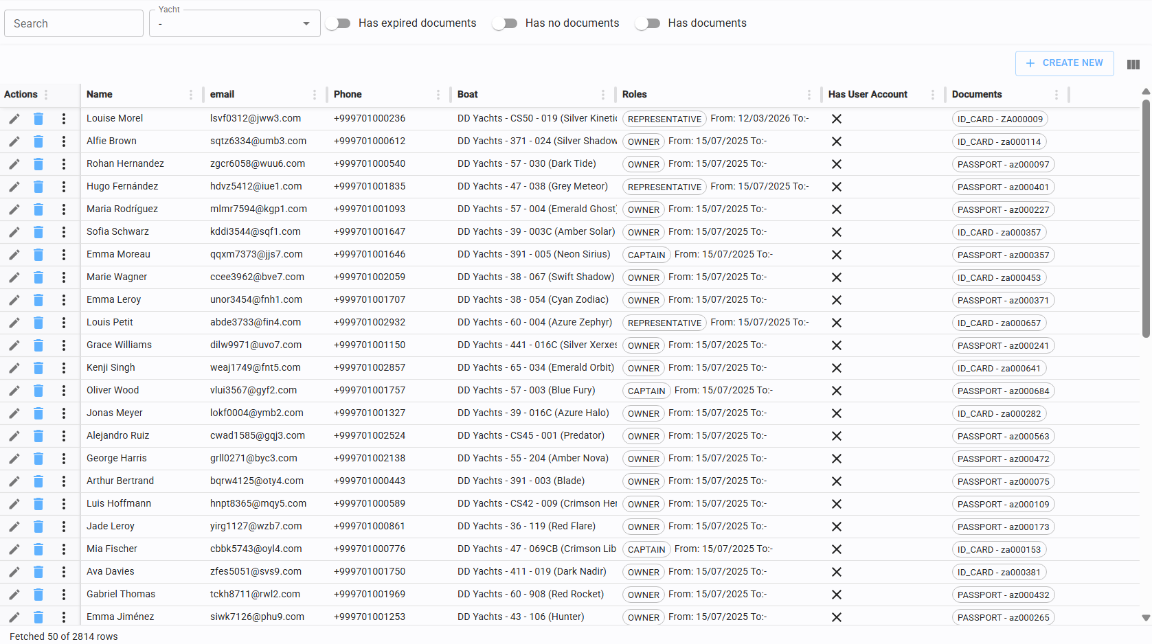 Click "Create New" in the top-left corner of the table to link a manager to a yacht.